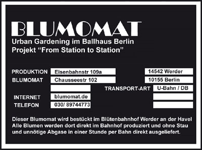 La cour végétalisée du Ballhaus Berlin dans le style du Urban Gardening fait partie du concept global du Blumomat. Quelques fleurs sont aussi cueillies ici, mais la plupart des fleurs sont produites dans la ville des fleurs de Werder/ Havel directement à côté de la gare. Elles sont fraîchement emballées là-bas et transporté à Berlin par le train en temps de record. Ainsi nous avons aussi inventé un nouveau concept de transport qui est durable et nous rend indépendants de la voiture et des embouteillages tout en préservant l’environnement.